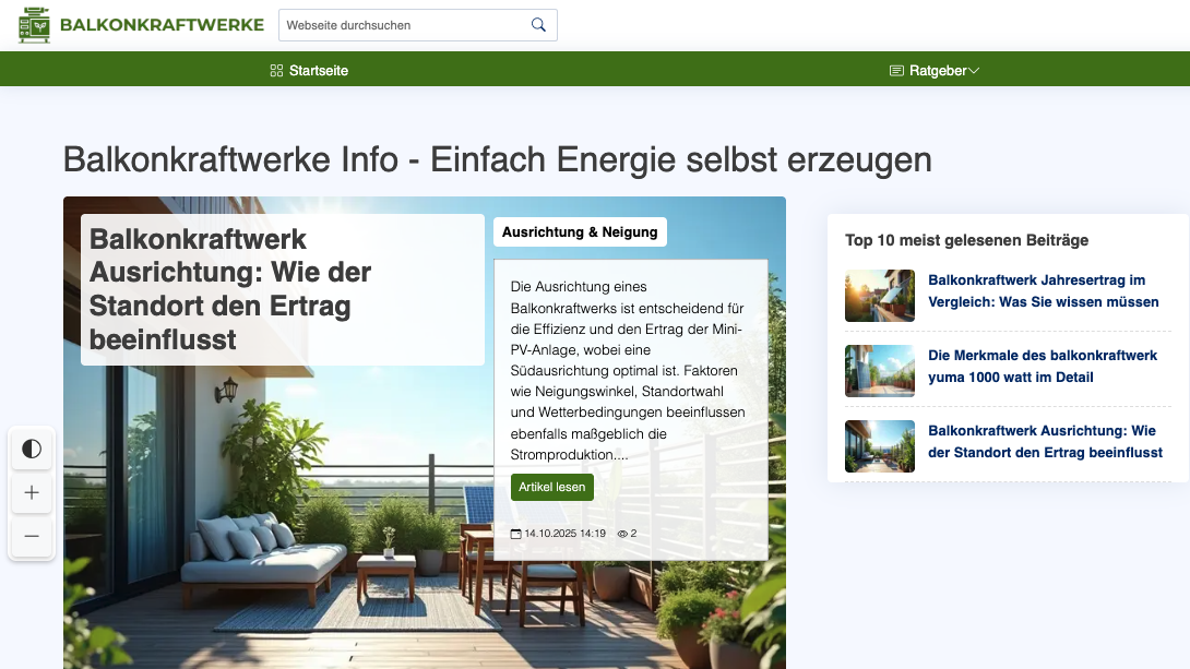 Balkonkraftwerke-Info.de ist dein praxisorientiertes Online-Portal rund um kleine Solaranlagen für Balkon und Balkon­kraftwerk-Plug-in-Module. Du findest verständliche Einsteiger- und Entscheidungsratgeber zu Technik, Leistung, Montage und Anschluss, Informationen zu Rechtlichem (Einspeisung, Anmeldung, Vorschriften) sowie Tipps zur Ertragsoptimierung, Sicherheit und Wartung. Ergänzt wird das Angebot durch Produktempfehlungen, Vergleichstabellen und Anwendungsbeispiele für Mieter und Wohnungseigentümer.