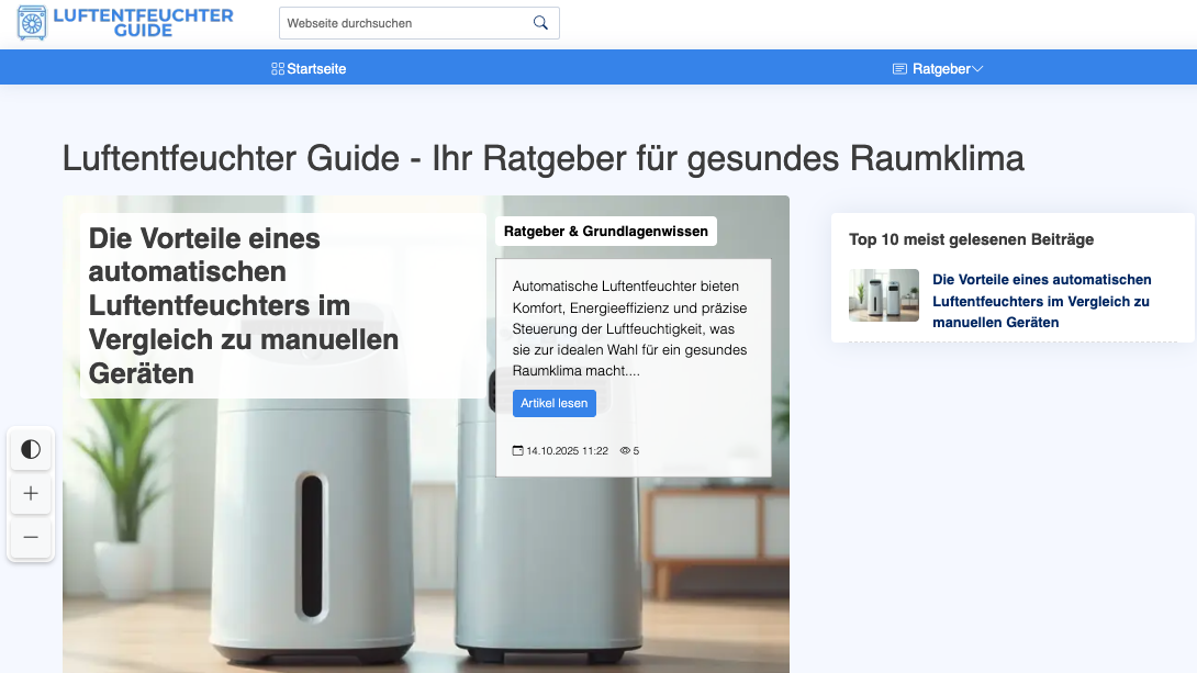 Luftentfeuchter-Guide.de ist dein praxisorientiertes Online-Portal rund um Luftentfeuchter und Luftfeuchte-Management. Du findest leicht verständliche Kauf- und Technik-Ratgeber zu Gerätetypen (Kompressor-, Adsorptions-/Trocknungstypen, Kondensationsgeräte), Entfeuchtungsleistung und Raumgrößen, Hinweise zu Energieeffizienz und Lautstärke sowie Anleitungen zu Installation, optimaler Einsatzplanung, Wartung und Filterpflege. Ergänzt wird das Angebot durch Tipps zur Schimmelprävention, Messung der Raumluftfeuchte, Vergleichstabellen und Produktempfehlungen für Haushalt, Keller und Gewerbe.