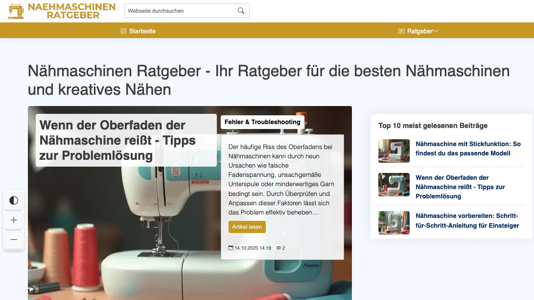 Naehmaschinen-Ratgeber.de ist dein praxisorientiertes Online-Portal rund um Nähmaschinen und Nähen. Du findest verständliche Kaufberatungen (mechanische vs. computergesteuerte Maschinen, Overlocker, Coverstitch), Vergleichstabellen, Erfahrungsberichte und Tipps zur richtigen Auswahl von Nadeln, Garn und Stoffen. Ergänzt wird das Angebot durch Schritt-für-Schritt-Anleitungen für Einsteiger und Fortgeschrittene, Wartungs- und Fehlerbehebungs-Guides sowie Empfehlungen für Zubehör, Nähprojekte und Schnittmuster.